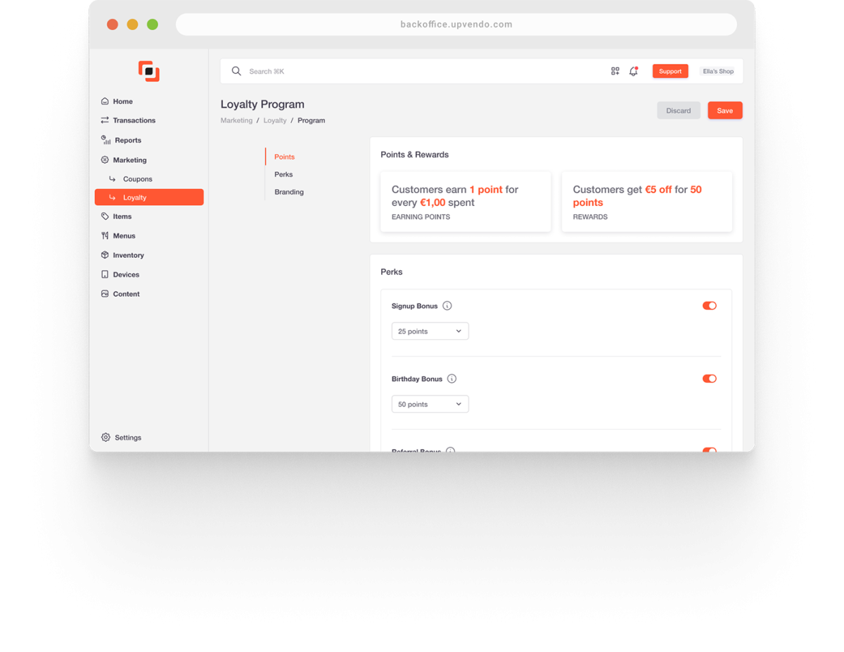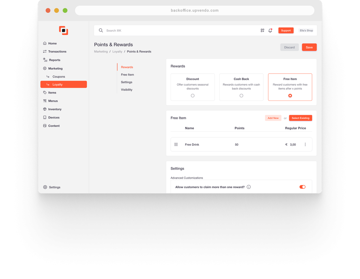You can advertise your loyalty program on kiosks and online ordering pages. Additionally, setting point values and minimum spends helps protect your profits while offering attractive rewards to customers.